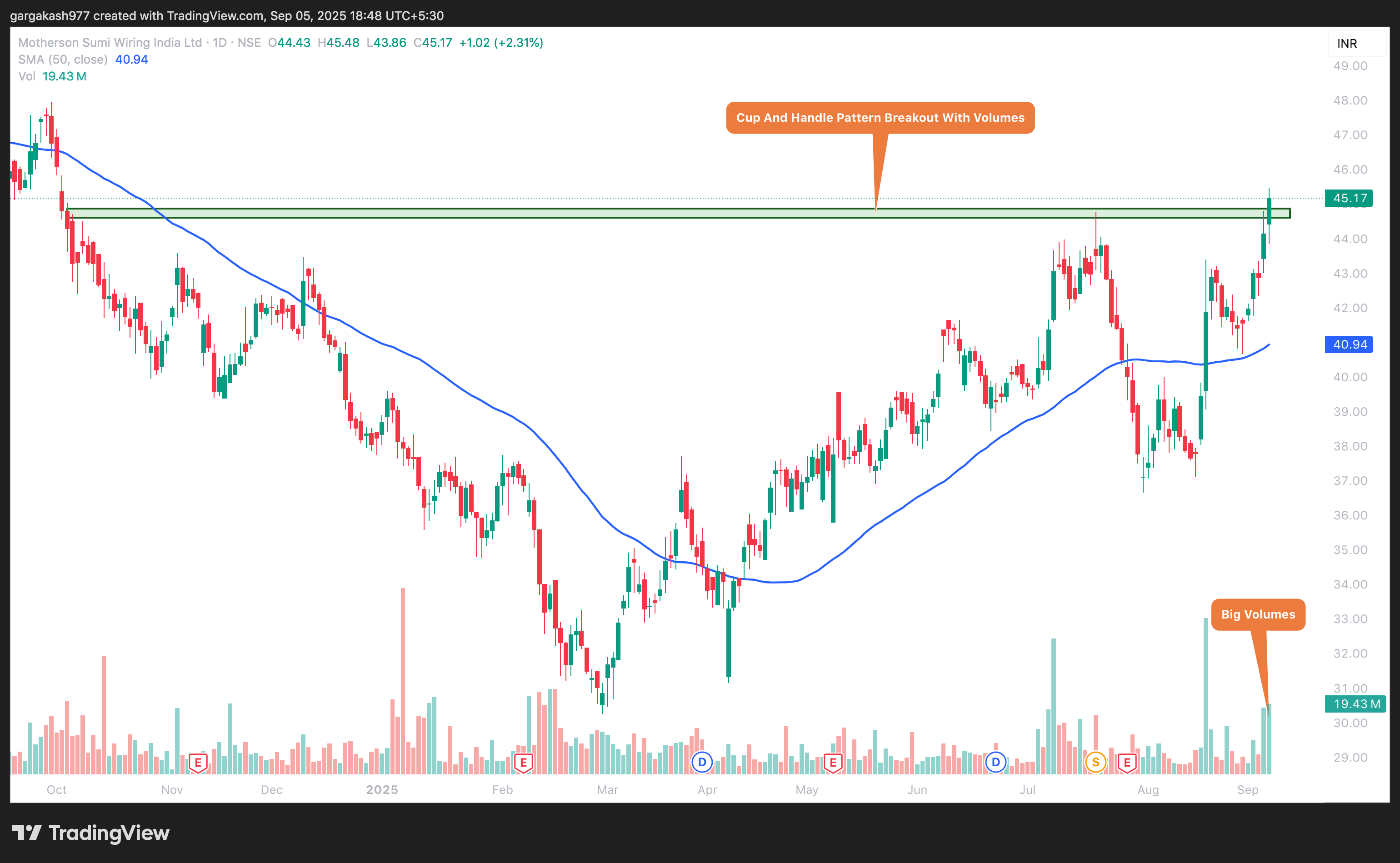 MSUMI has registered a breakout from the cup and handle pattern, a bullish continuation signal that often precedes sizable upward moves. What adds strength to this breakout is the presence of heightened volumes, confirming buyer interest. This stock could see a strong follow-through rally in the short term, providing a compelling swing opportunity.
