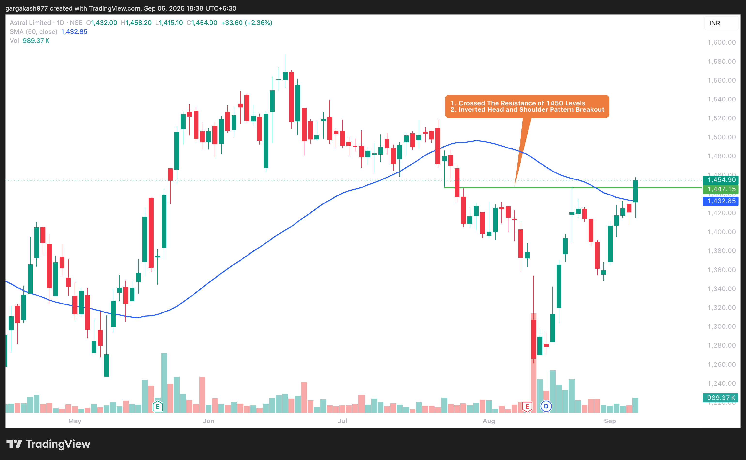 Astral has delivered a textbook inverted head and shoulder breakout, confirming bullish momentum. The stock has also crossed its major resistance zone with strong volumes, signaling that market participants are actively supporting this move. If the momentum sustains, Astral could see a good upside in the coming sessions, making it a high-potential swing candidate.